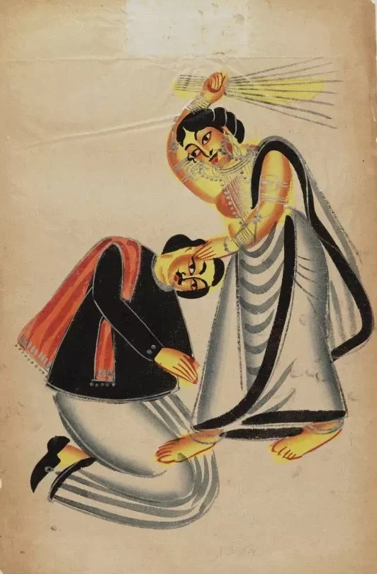Kalighat paintings, born amidst the bustling streets and chaotic rhythm of 19th-century Calcutta, offer a masterful and sardonic glimpse into the hypocrisy of society. At first glance, these works may appear deceptively simple — watercolor strokes on paper, vibrant colors embracing figures that seem whimsical, almost playful.